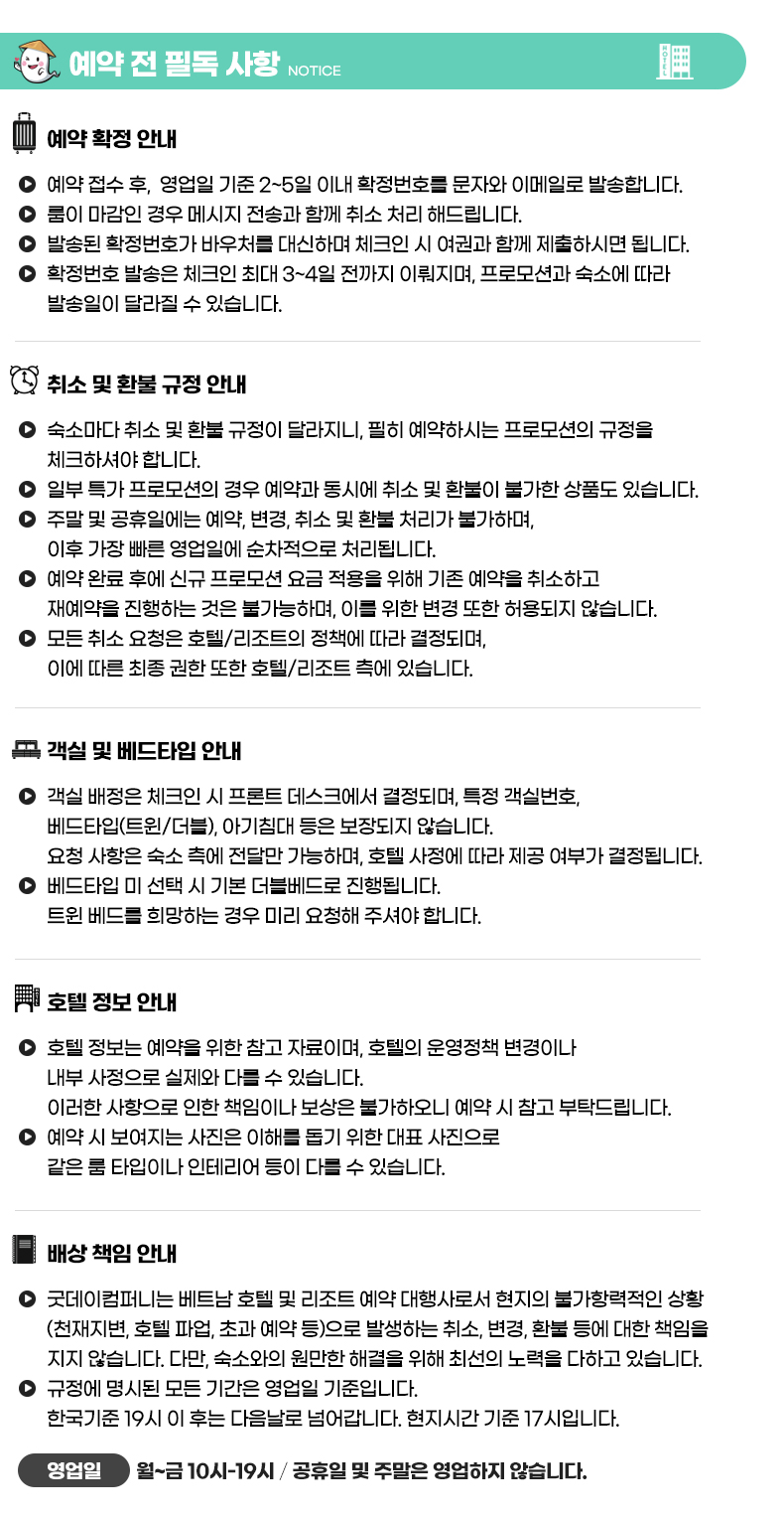- 호텔별로 확정 안내 일자가 상이함으로 대기해 주시면 빠른 안내 드리도록 하겠습니다.