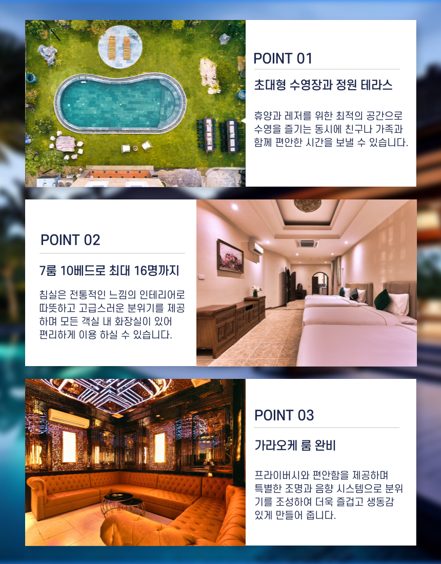 프라이빗 야외수영장과 노래방까지 완벽하게 갖추고있습니다.