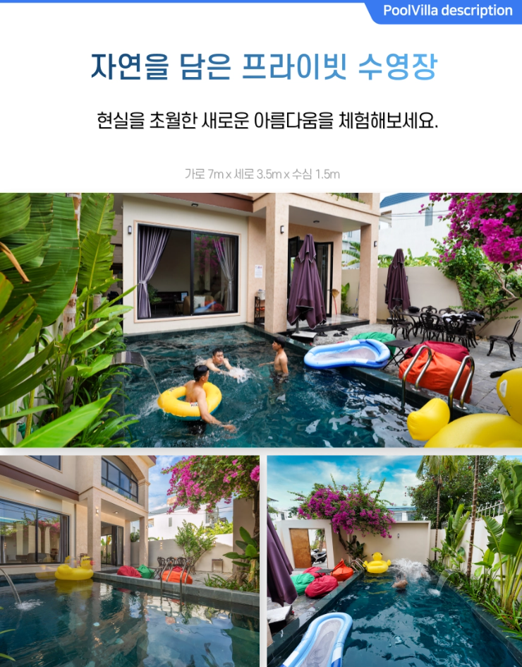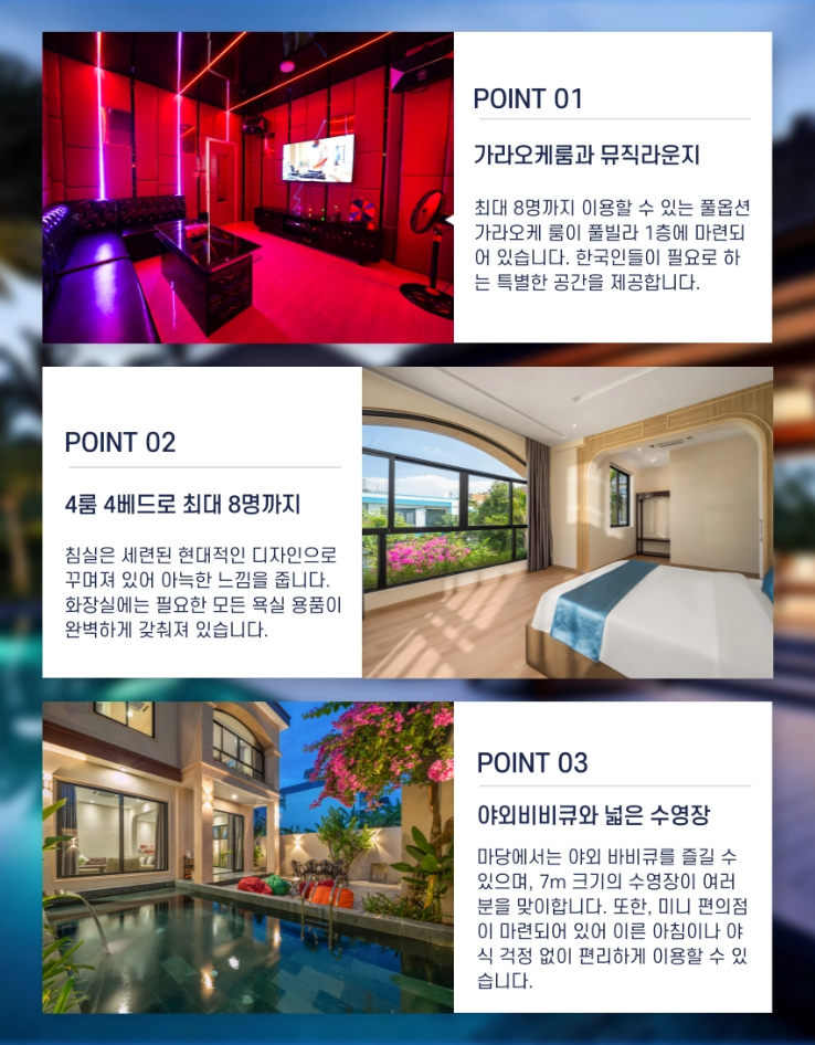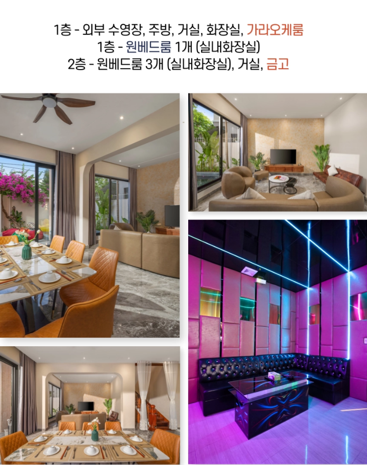 👉 최대 8명까지 투숙 가능한 4개의 룸과 개별 노래방, 독립적인 주방과 넓은 거실, 프라이빗 야외수영장과 간이 편의점까지 완벽하게 갖추고있습니다.