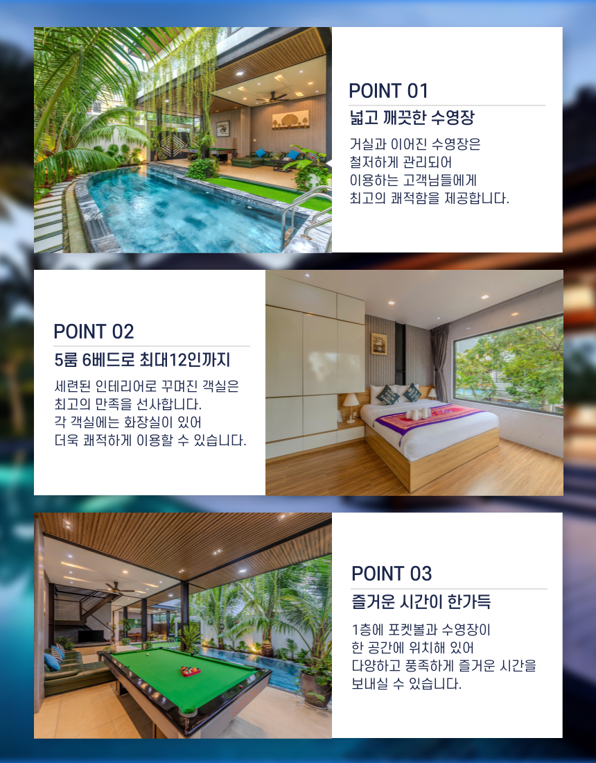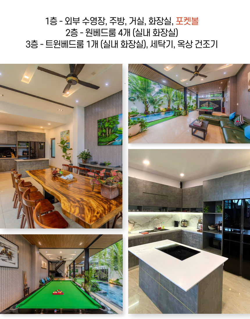 1층 - 외부 수영장 / 주방 / 거실 / 화장실 / 포켓볼 2층 - 원베드룸 4개 (실내 화장실) 3층 - 트원베드룸 1개 (실내 화장실) / 세탁기 / 옥상 건조기 👉 최대 11명까지 투숙 가능한 5개의 룸  👉 체크인 -14:30 / 체크아웃 - 11:30