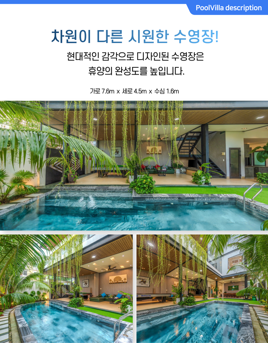 • 당구대와 수영장이 한 공간에 위치해 있어 다양하고 풍족하게 즐거운 시간을 보내실 수 있습니다.