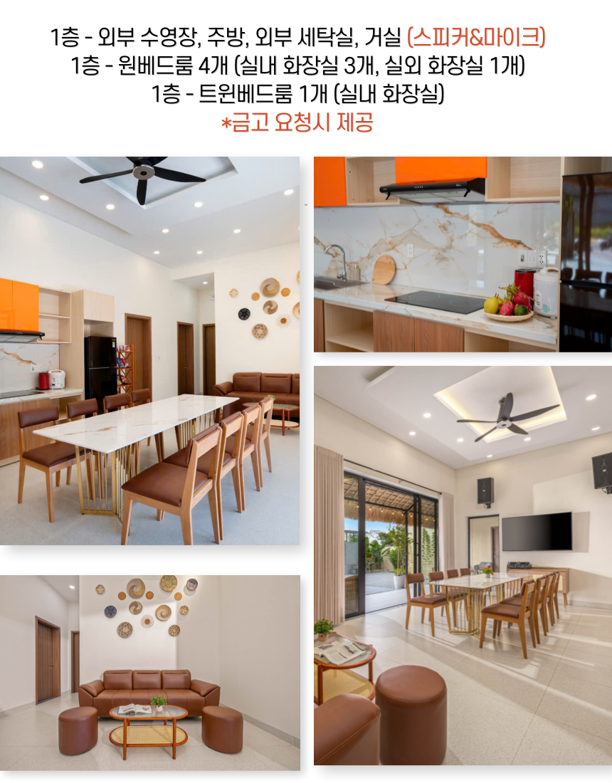 1층 - 외부 수영장 / 주방 / 외부 세탁실 / 거실 (스피커&마이크) 1층 - 원베드룸 4개 (실내화장실 3개, 실외화장실 1개) 1층 - 트원베드룸 1개(실내화장실) 각방 개별에어컨, 샤워용품 및 일회용품 👉 최대 10명까지 투숙 가능한 5개의 룸  👉 체크인 -14:30 / 체크아웃 - 11:30