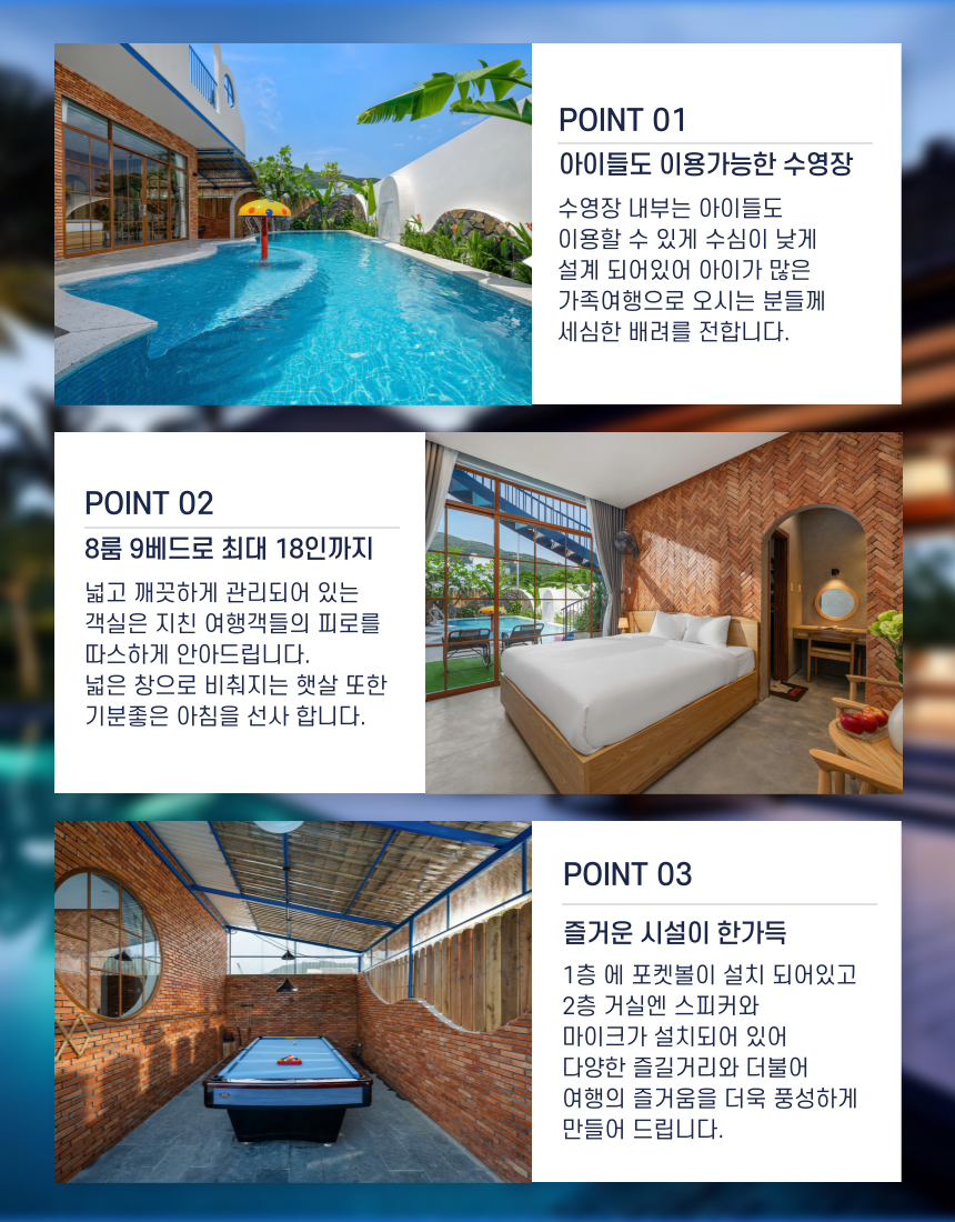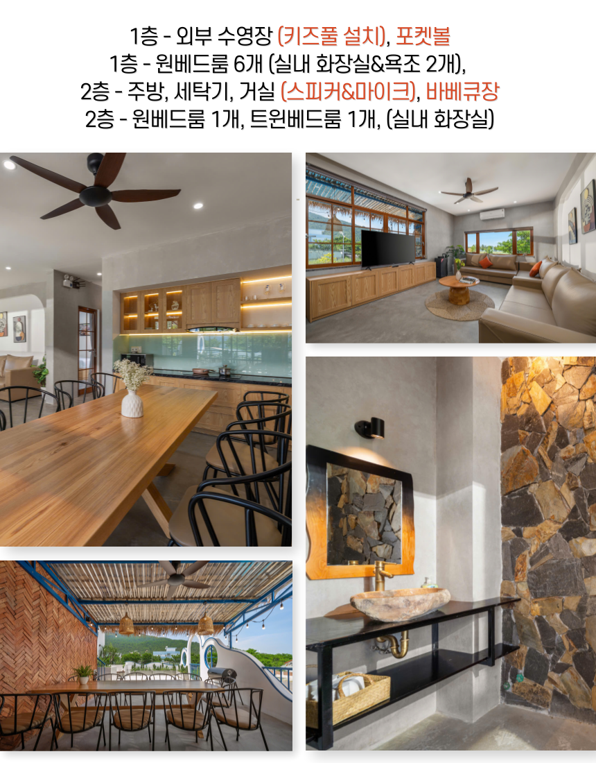 1층 - 외부 수영장 (키즈풀 설치) / 포켓볼 1층 - 원베드룸 6개 (실내 화장실, 욕조 2개) 2층 - 주방 / 세탁기/ 거실 (스피커&마이크) / 바베큐장 2층 - 원베드룸 1개 / 트원베드룸 1개 / (실내 화장실) 👉 최대 16명까지 투숙 가능한 8개의 룸 ​👉체크인 -14:30 / 체크아웃 - 11:30