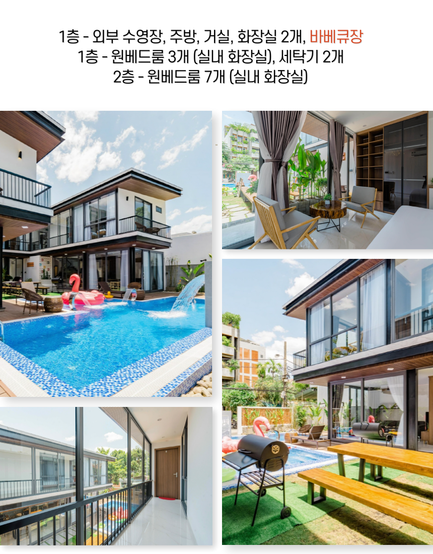 1층 - 외부 수영장 / 주방 / 거실 / 화장실 2개 / 바베큐장 1층 - 원베드룸 3개 (실내 화장실) / 세탁기 2층 - 원베드룸 7개 (실내 화장실) 👉 최대 20명까지 투숙 가능한 10개의 룸 👉체크인 -14:30 / 체크아웃 - 11:30