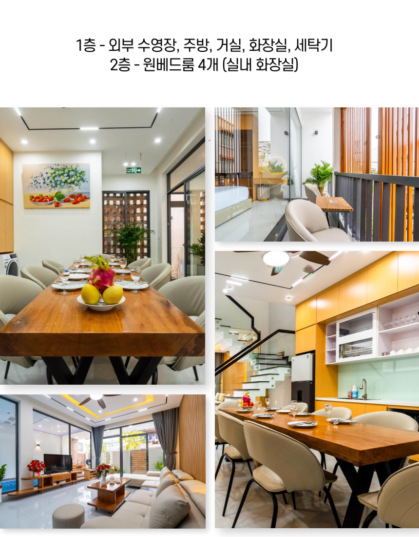 1층 - 외부 수영장 / 주방 / 거실 / 화장실 / 세탁기 2층 - 원베드룸 4개 (실내 화장실) 👉 최대 8명까지 투숙 가능한 4개의 룸  👉 체크인 -14:30 / 체크아웃 - 11:30