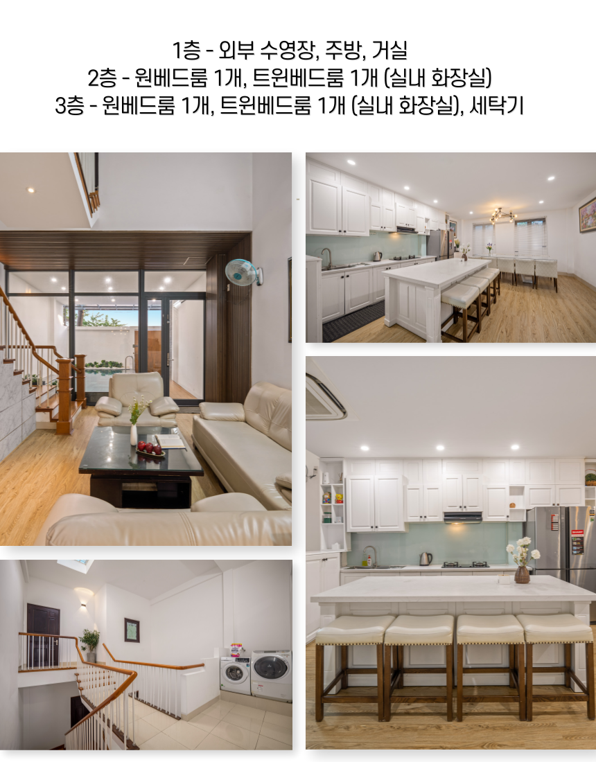1층 - 외부 수영장 / 주방 / 거실 2층 - 원베드룸 1개 / 트원베드룸 1개 (실내 화장실) 3층 - 원베드룸 1개 / 트원베드룸 1개 (실내 화장실) / 세탁기 👉 최대 8명까지 투숙 가능한 4개의 룸  👉 체크인 -14:30 / 체크아웃 - 11:30
