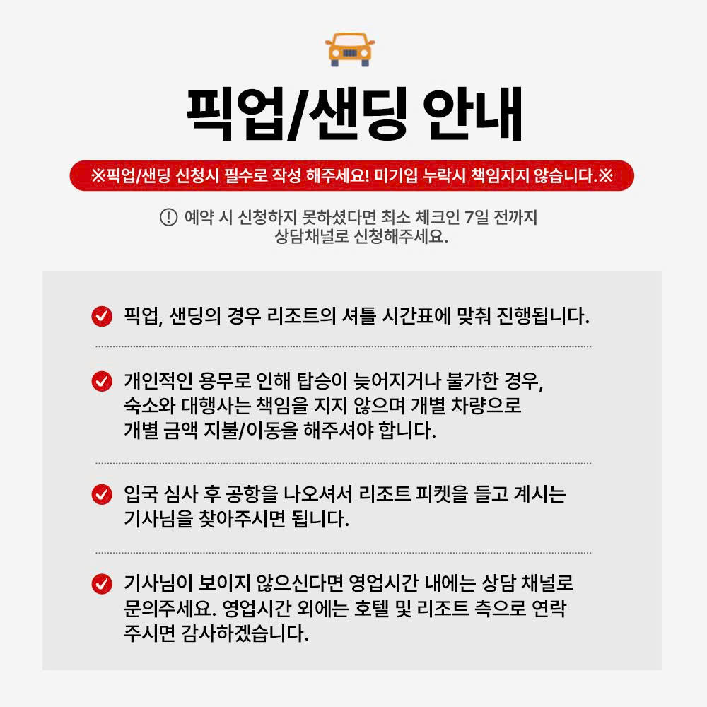 ◾ 픽업 시간 10분 전까지 도착 필수 (셔틀 놓칠 경우 개별 이동)
