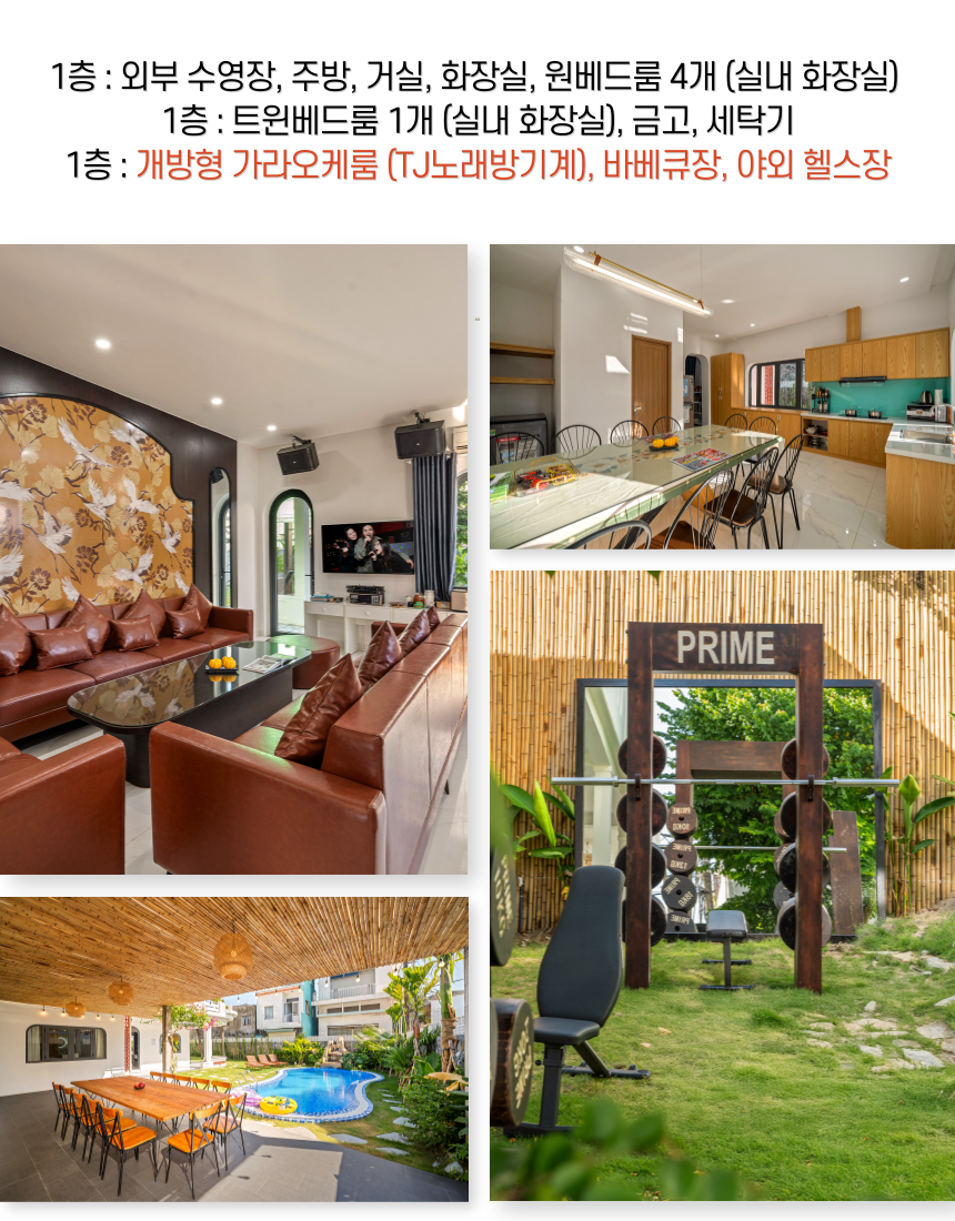 1층 - 외부 수영장 (온수풀 설치) / 주방 / 거실 / 화장실 / 원베드룸 4개 (실내 화장실) 1층 - 트원베드룸 1개 (실내 화장실) / 금고 / 세탁기 1층 - 개방형 가라오케룸 (TJ 노래방기계) / 바베큐장 / 야외 헬스장 👉 최대 10명까지 투숙 가능한 5개의 룸 👉 체크인 -14:30 / 체크아웃 - 11:30