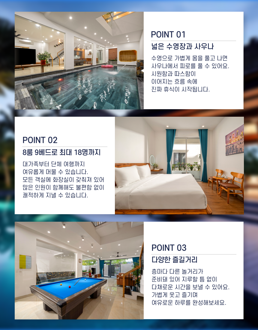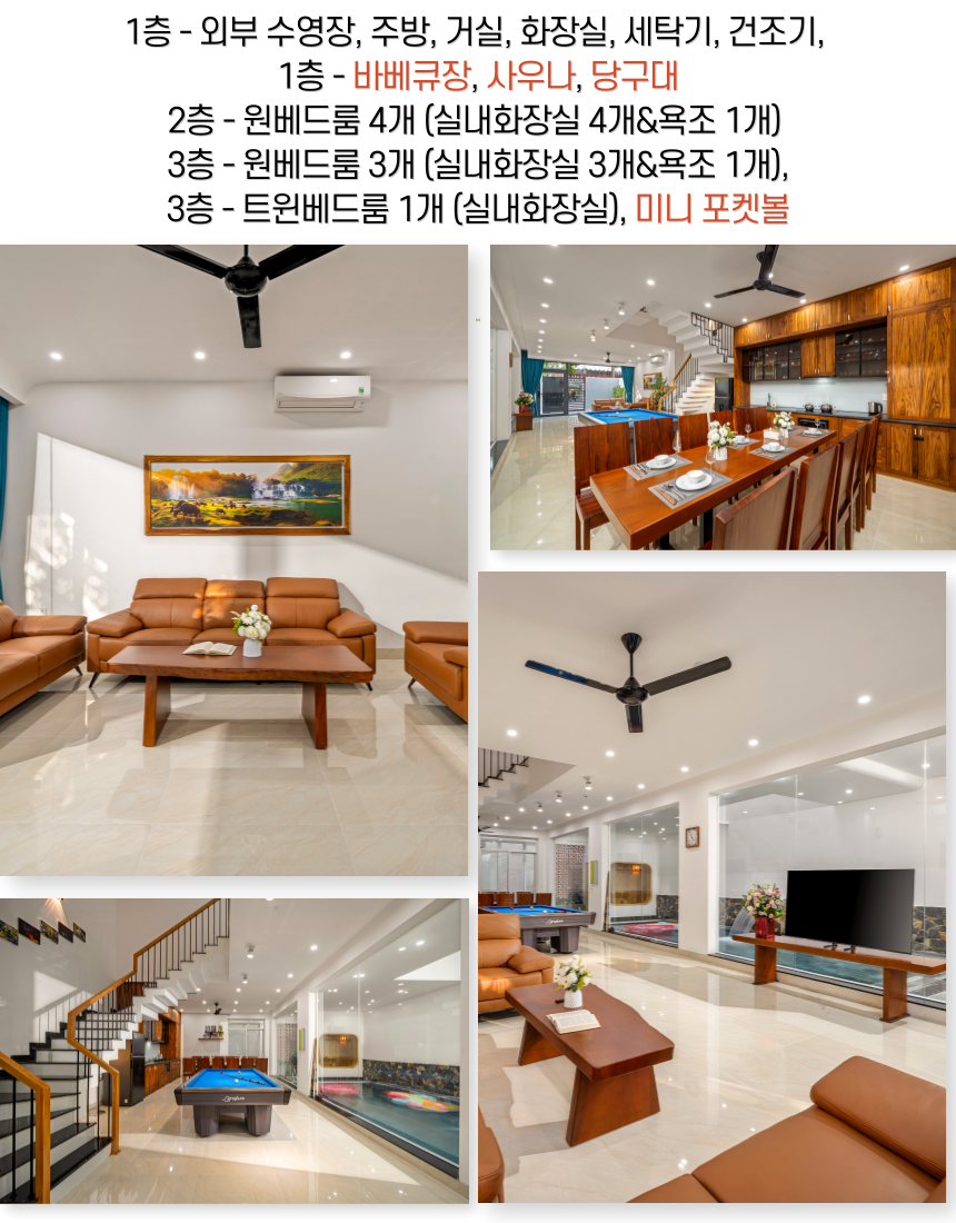 1층 - 외부수영장 / 주방 / 거실 / 화장실 / 세탁기 / 건조기 1층 - 바베큐장 / 사우나 / 당구대 2층 - 원베드룸 4개 (실내화장실 4개, 욕조 1개) 3층 - 원베드룸 3개 (실내화장실 4개, 욕조 1개) 3층 - 트원베드룸 1개 (실내화장실) / 미니 포켓볼 각방 개별에어컨 ​ 👉 최대 16명까지 투숙 가능한 8개의 룸 👉체크인 -14:30 / 체크아웃 - 11:30