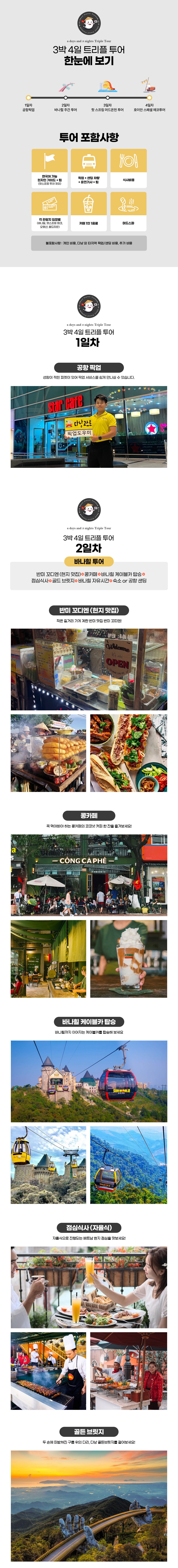숙소 픽업 → 반미 꼬디엔(현지식 맛집) → 콩카페 → 바나힐 케이블카 탑승 → 점심식사 → 골드 브릿지 → 바나힐 자유시간 → 숙소 or 공항샌딩