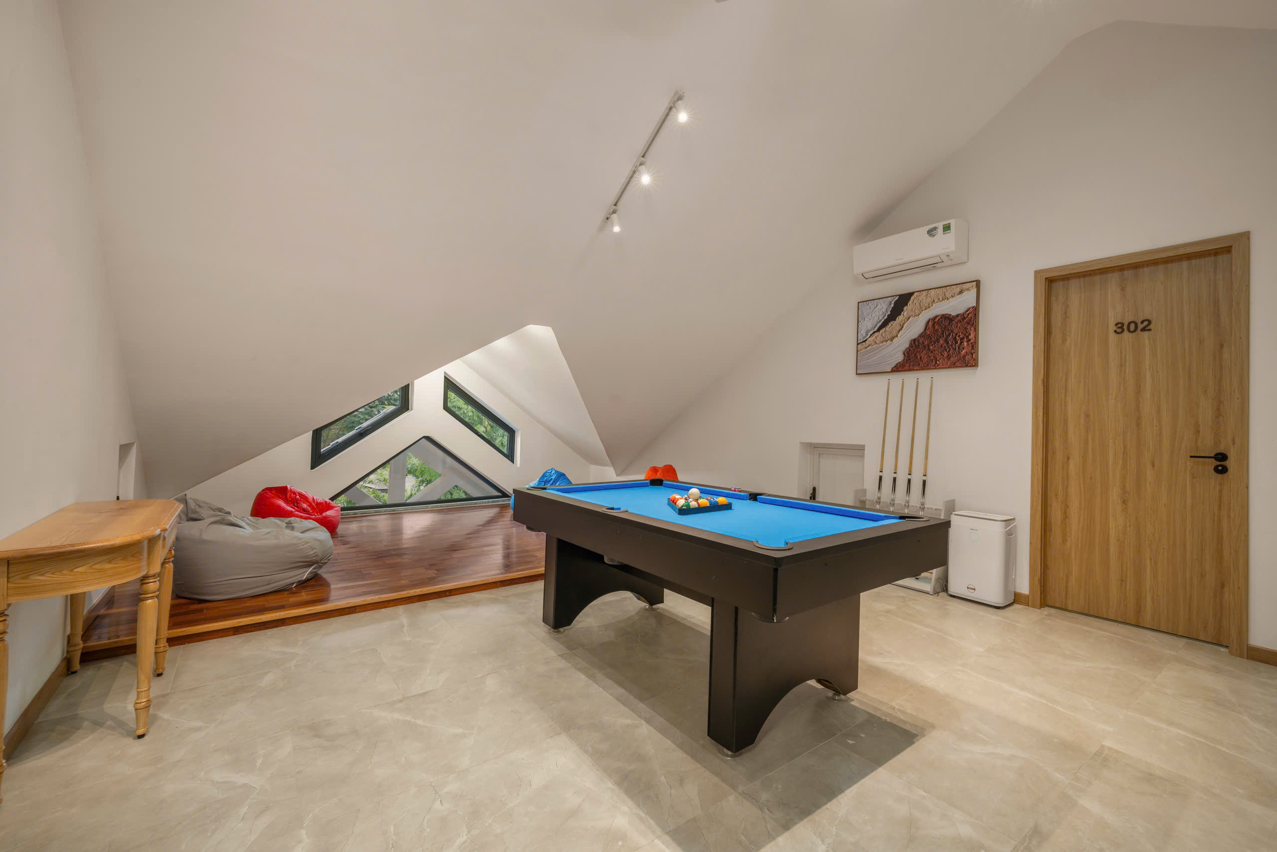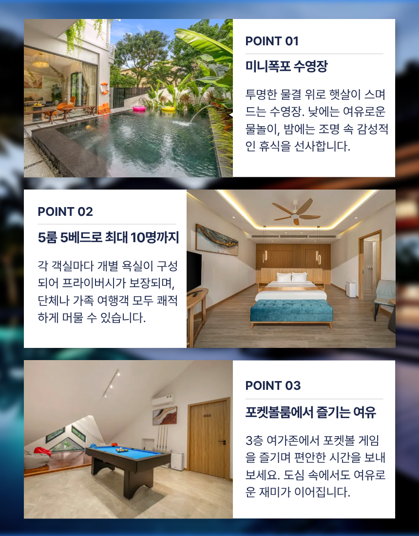 1층 - 외부 수영장 / 거실 / 주방 / 화장실 2층 - 원베드룸 3개 (각 내부 욕실) / 실내 욕조 3층 - 원베드룸 2개 (각 내부 요실) / 포켓볼 / 세탁기 / 건조기 👉 최대 10명까지 투숙 가능한 5개의 룸 👉 체크인 -14:30 / 체크아웃 - 11:30