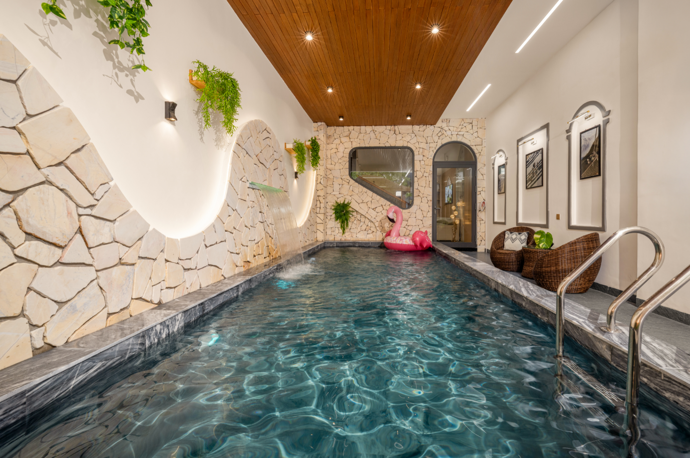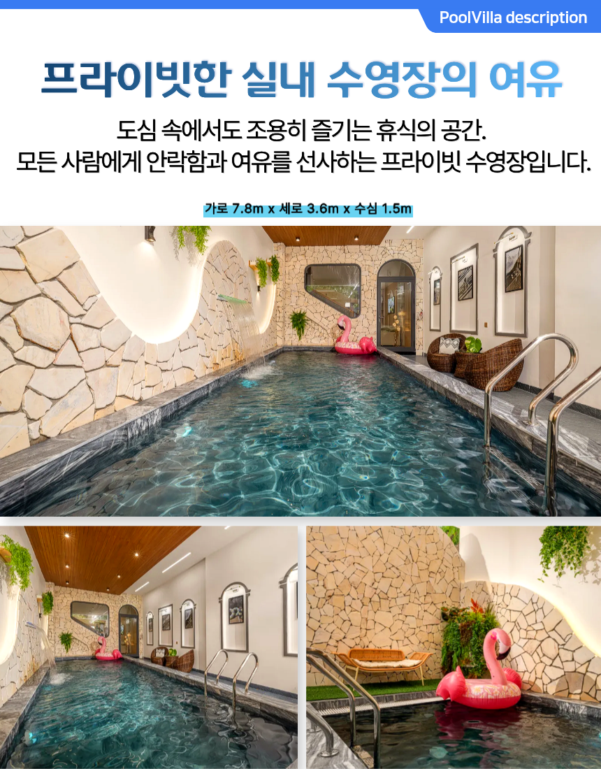 1층 - 실내 수영장 / 거실 / 주방 / 화장실 / 세탁기 / 건조기 2층 - 거실 / 원베드룸 1개 (내부 욕실) 트원베드룸 1개 (내부 욕실) / 실내 욕조 1개 3층 - 거실 / 원베드룸 1개 (내부 욕실) 트원베드룸 1개 (내부 욕실) / 실내 욕조 1개 👉 최대 8명까지 투숙 가능한 4개의 룸  👉 체크인 -14:30 / 체크아웃 - 11:30