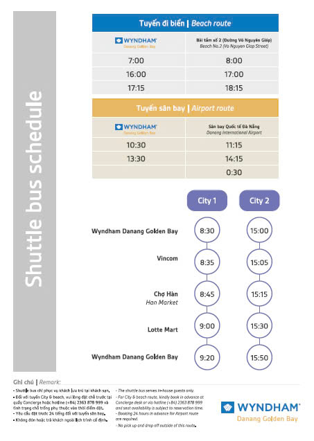 * 시내 및 해변 노선의 경우 컨시어지 카운터 또는 핫라인(+84) 2363878999에서 사전 예약하세요.