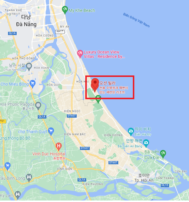 차량으로 다낭 시내 지역에서 약 25분 , 다낭 공항에서 약 30분, 호이안까지는 약 25분 정도 거리에 위치해 있습니다.