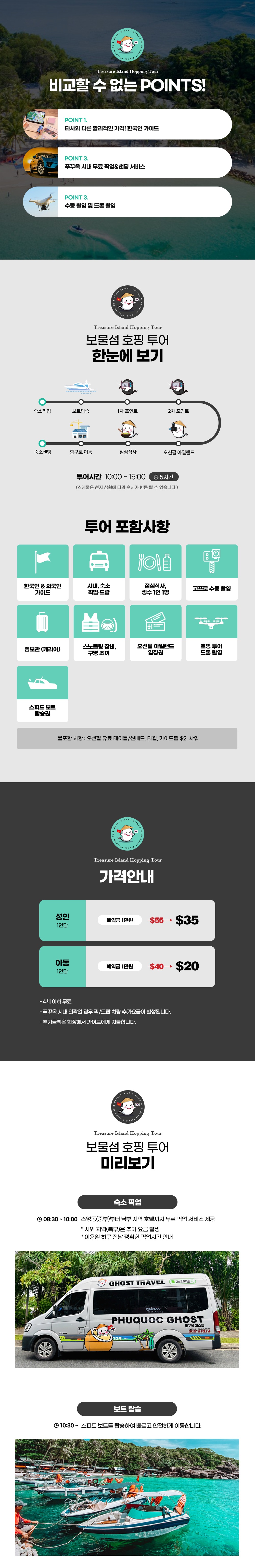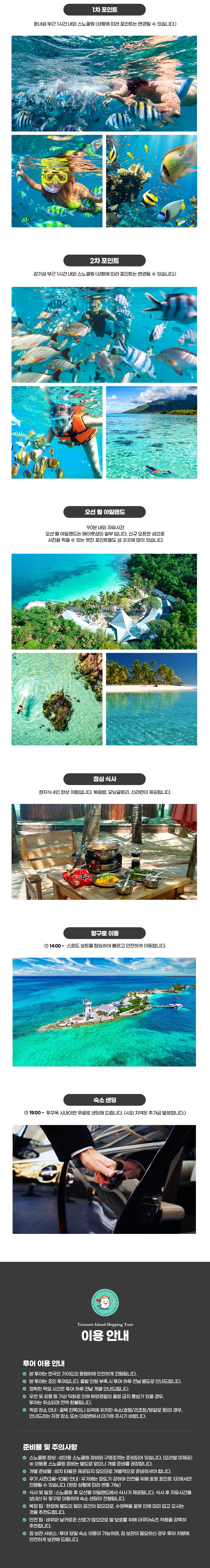 픽업 → 스피드보트탑승 → 1차포인트(혼려섬 부근) → 2차포인트(감기섬 부근) →오션펄아일랜드 →호텔샌딩